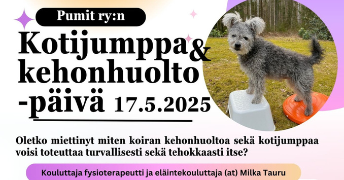 Päivä alkaa tunnin kestoisella luennolla, josta saat vinkkejä sekä tietoa kotijumpasta, koiralle sopivasta kehonhuollosta sekä mahdollisten liikkumisen ongelmien tunnistamisesta. Tietopaketin jälkeen luvassa on jokaiselle koirakkopaikkalaiselle 30min yksilöllistä harjoitusaikaa. Koirakkopaikalta saat juuri koirallesi räätälöidyt harjoitusohjeet kotijumppaan sekä selkeät ohjeet miten toteuttaa kehonhuoltoa helposti kotona (venyttely, hieronta).